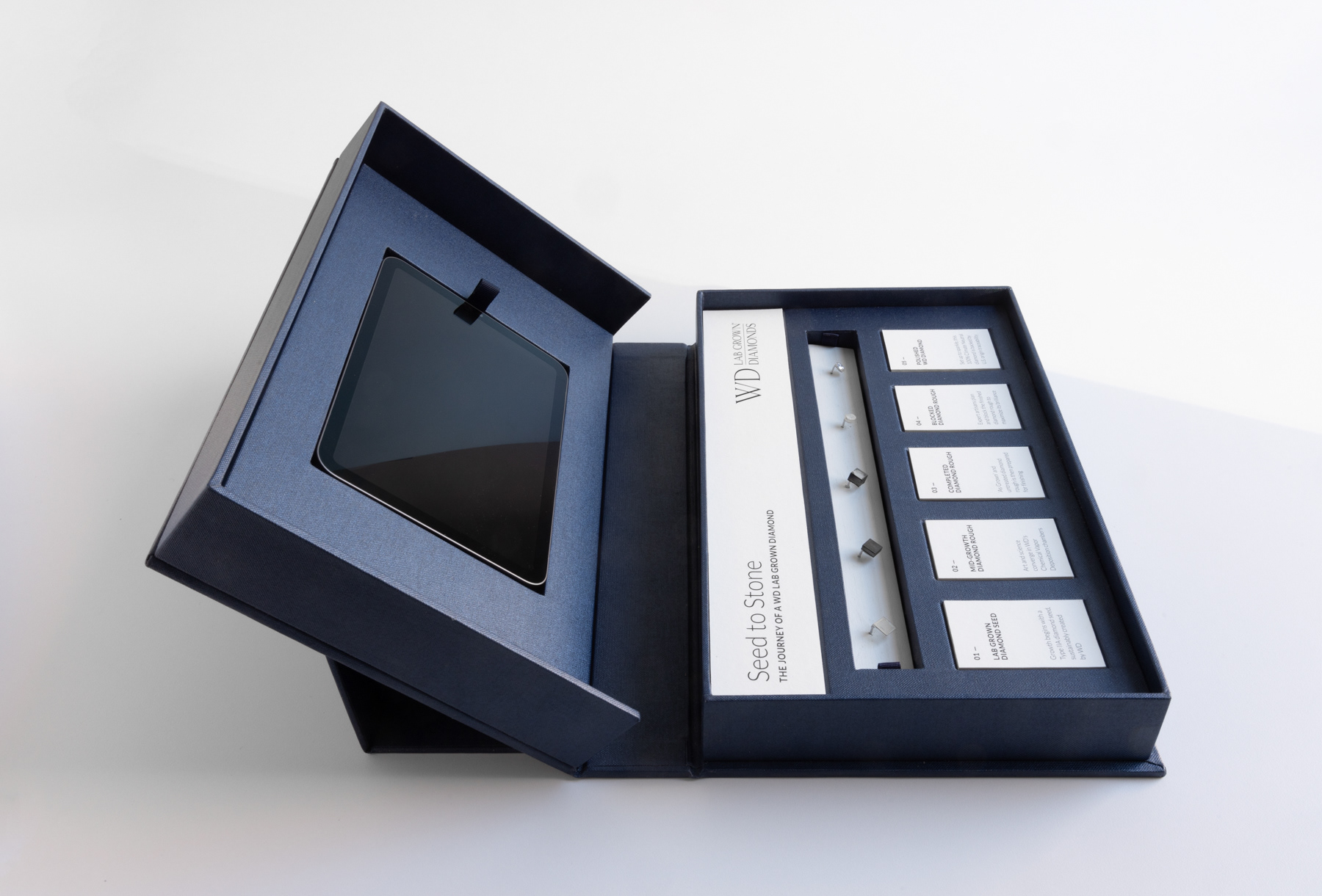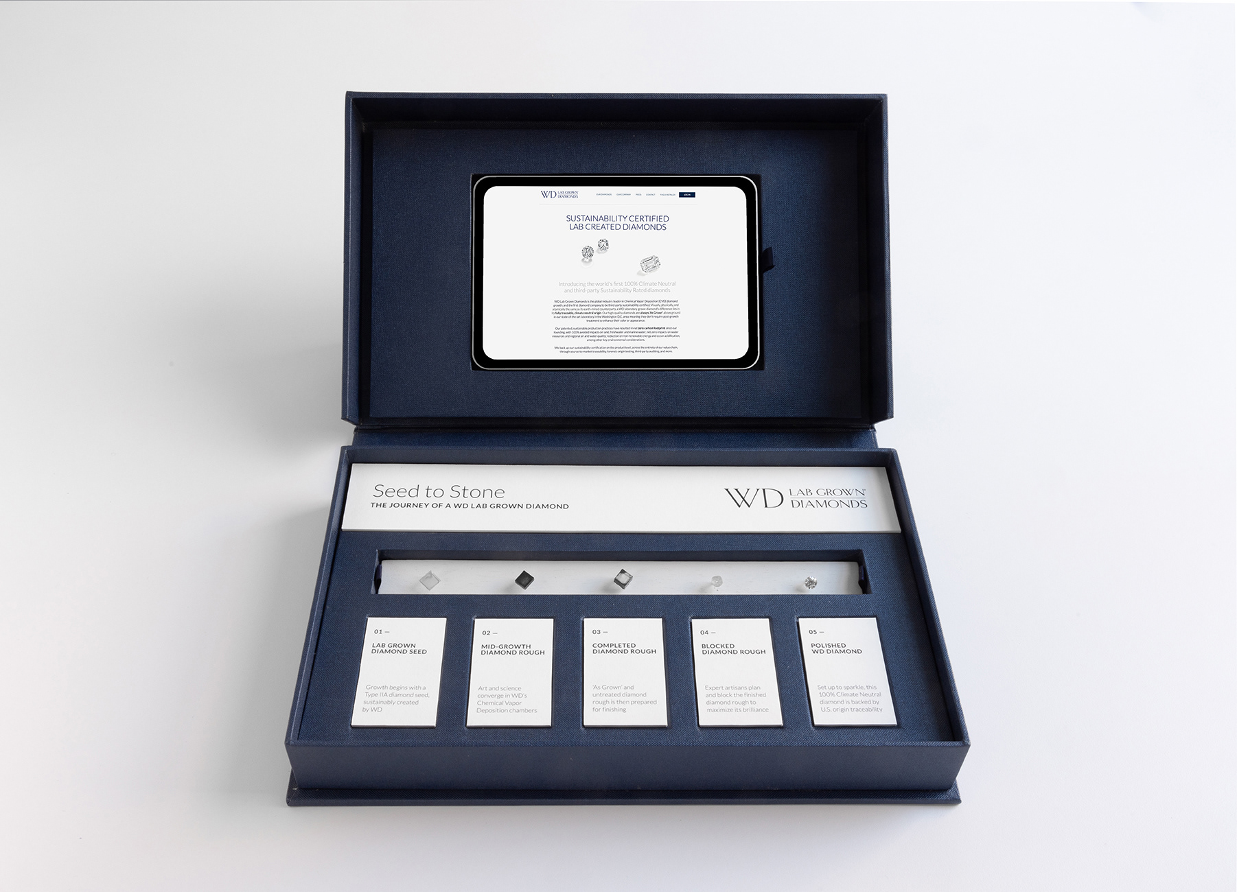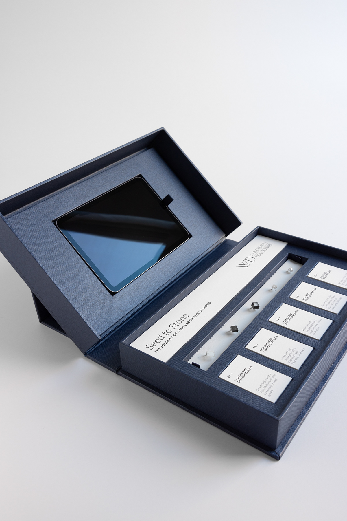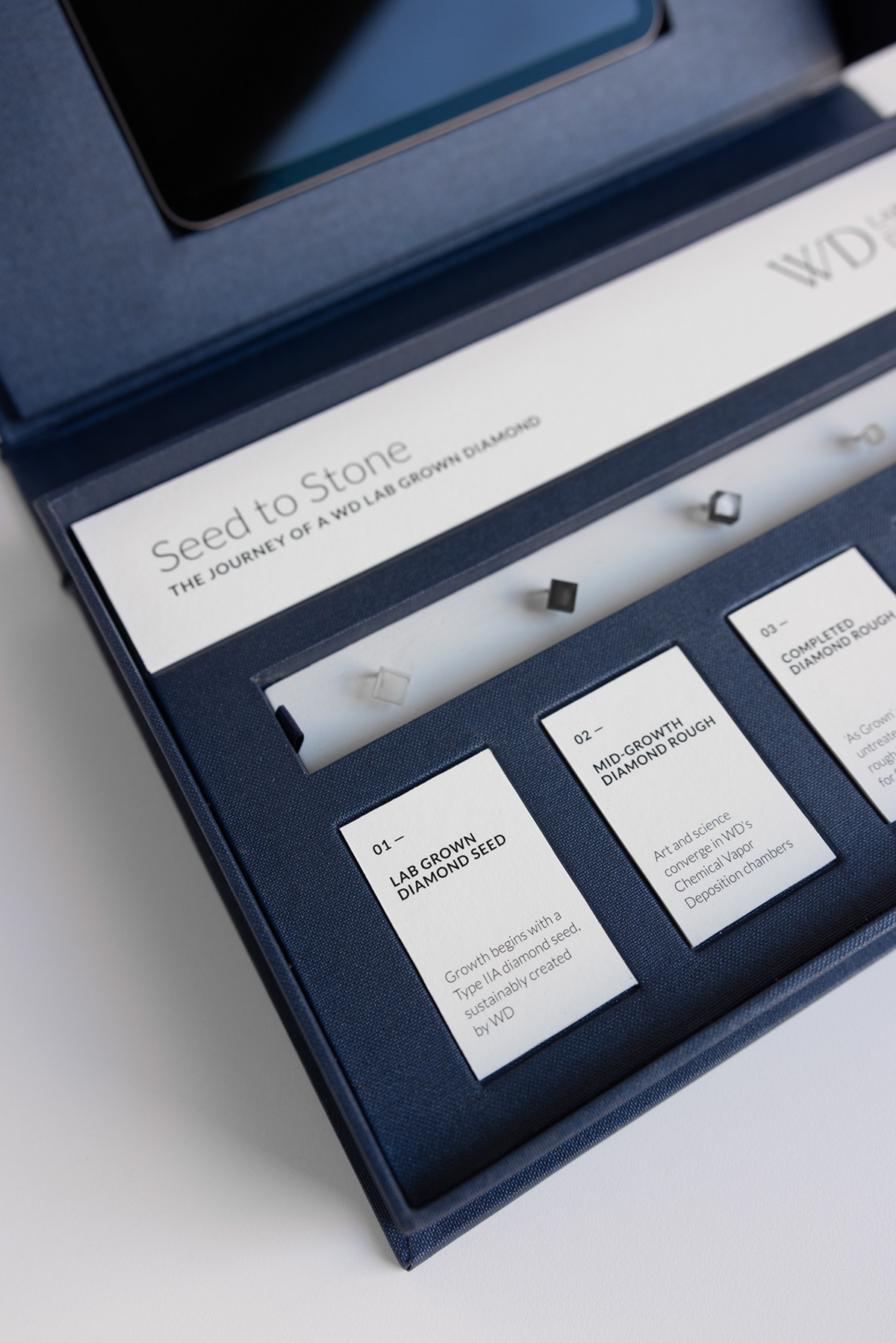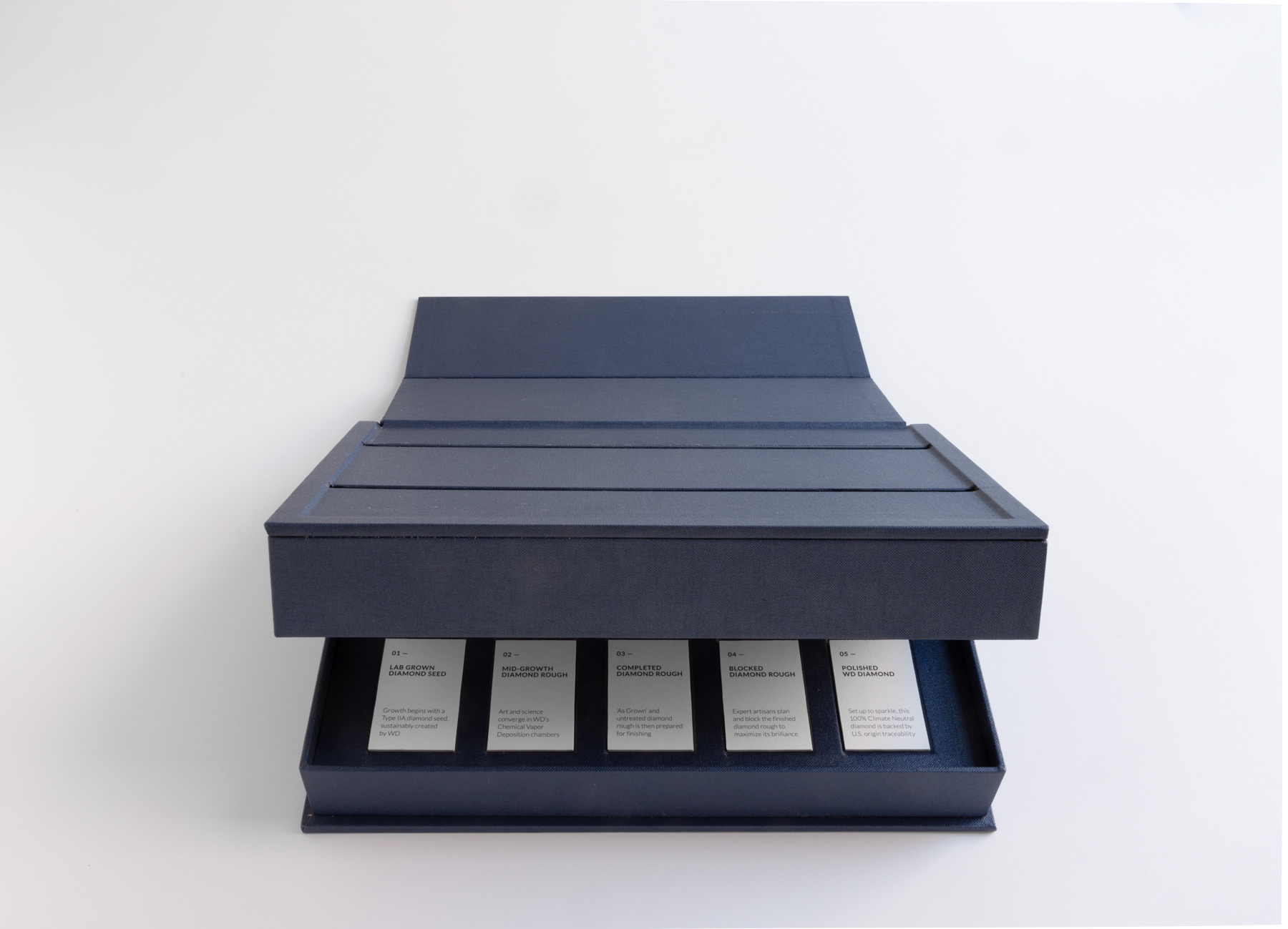 A presentation box designed to bring an elevated experience to the technical craft of Chemical Vapor Deposition diamond growing for WD Lab Grown Diamonds. Created for use across marketing and sales, the box serves both the parent wholesale manufacturing company and its luxury retail brand, Latitude Diamonds.